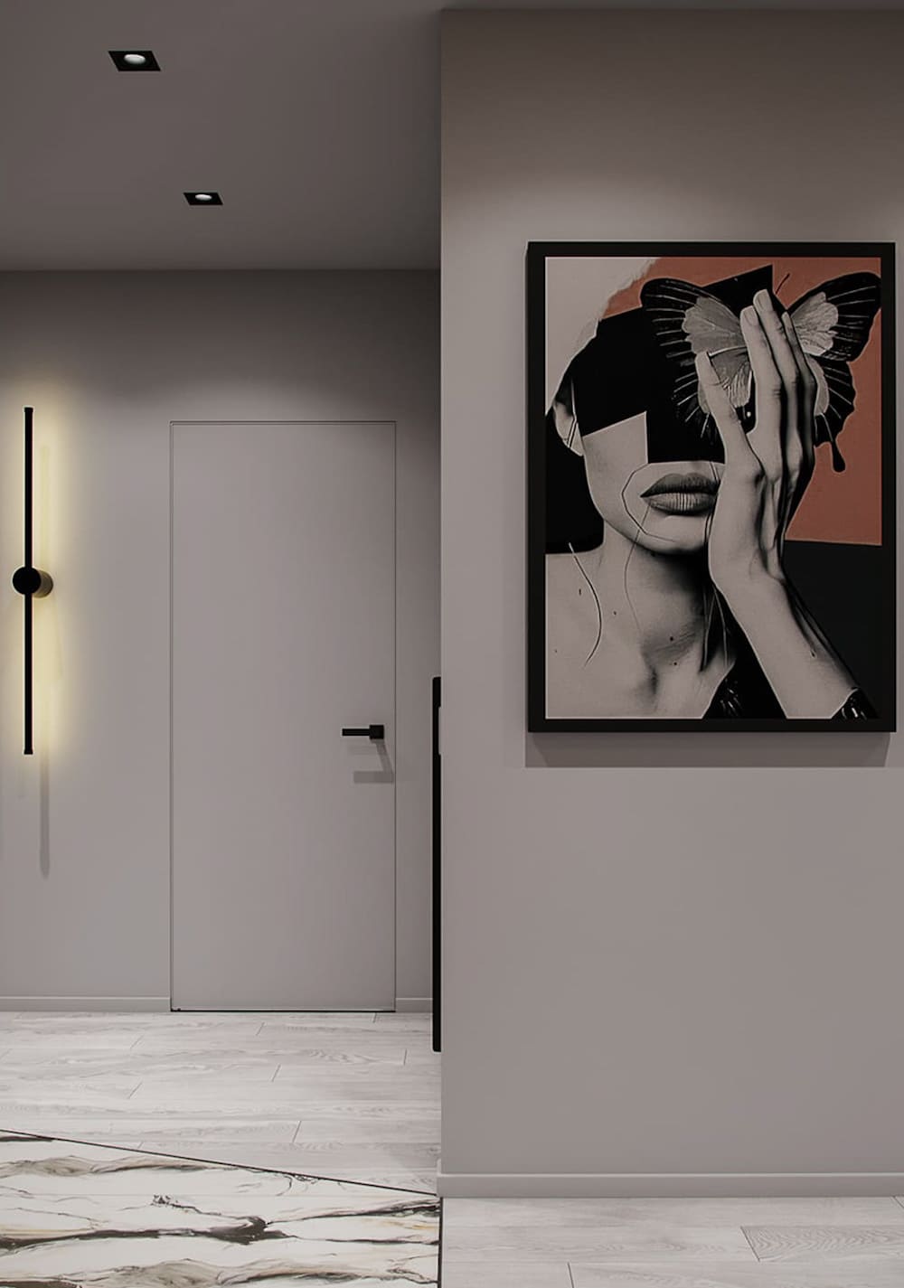 Люстры и классические светильники в прихожих совсем не актуальны. Особенно, когда это стандартная прихожая-коридор без окон в квартире. Тебе нужна серия потолочных светильников и зональная подсветка у зеркала и других важных зон. Интересный прием – подсветка у пола вдоль шкафа, чтобы можно было легко пройти даже ночью.