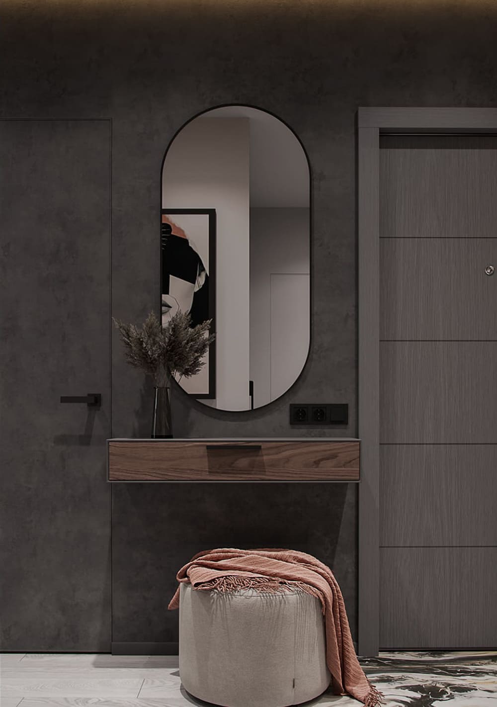 - зеркало — если коридор имеет просторные размеры, можно подобрать в него большое зеркало в полный рост человека. Если пространство маленькое, можно ограничиться небольшим зеркалом на внутренней стороне дверки шкафа. Но отказываться от такого предмета нельзя, иначе прихожая утрат функциональность;