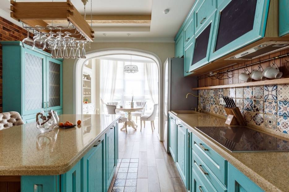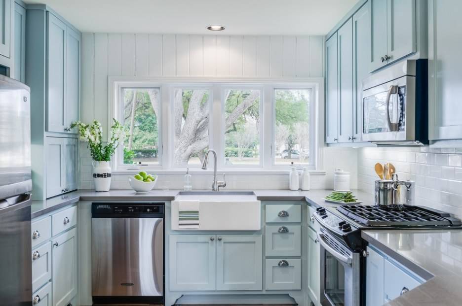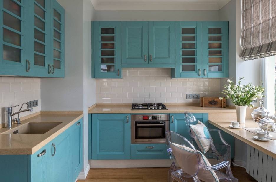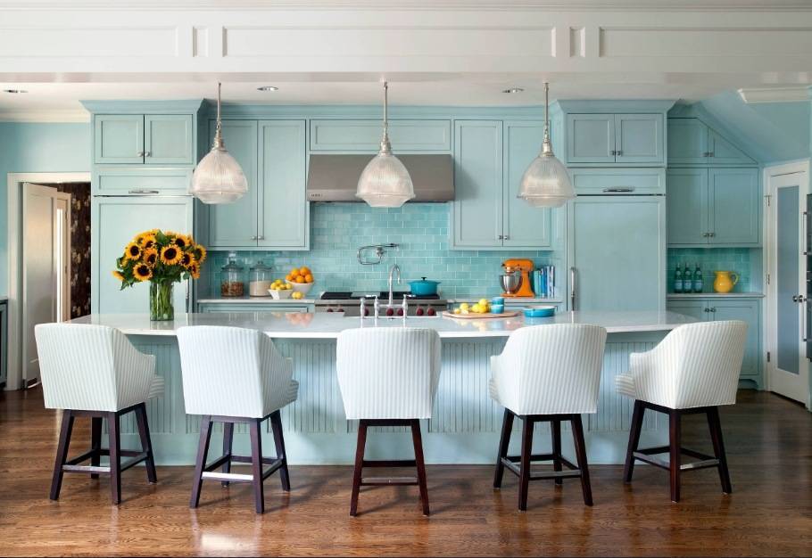 Безусловно, кухонный гарнитур в белом или бежевом цвете считается самым универсальным. Поскольку при желании можно изменить интерьер в короткие сроки без больших затрат. Тем не менее, голубой гарнитур выглядит по-своему привлекательно, стильно. Главное – подобрать мягкие оттенки, которые будут радовать вас длительное время. Дизайнеры рекомендуют отказаться от слишком ярких решений, поскольку они могут быстро наскучить.