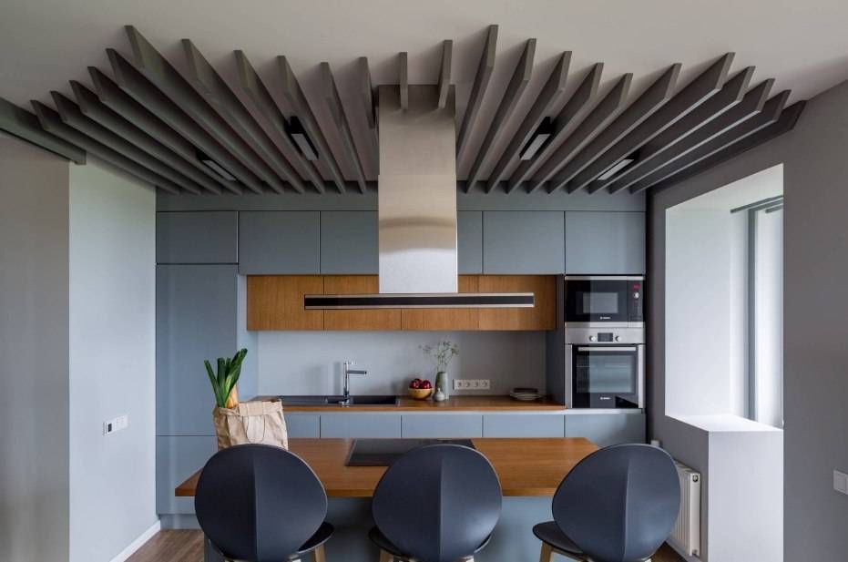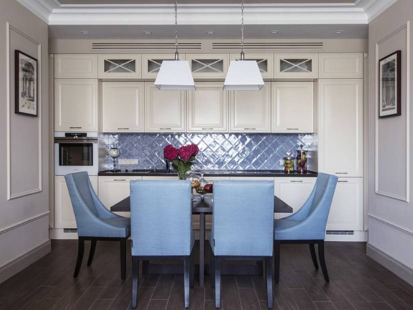 Стильное оформление кухонного пространства, которое не только не выходит из моды, но и становиться все более популярным. Громоздкая мебель, симметричное расположение каждой детали, четкие линии и ровные фактуры. Такой стиль приветствует выдержанные цвета и правильные геометрические формы. Классике можно следовать даже в выборе зонирования, который однозначно станет своеобразной изюминкой. Например, оформить одну из стен с помощью дерева или металла, а параллельную – однотонными матовыми обоями.