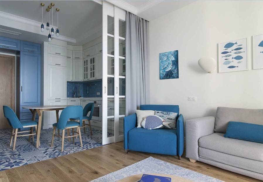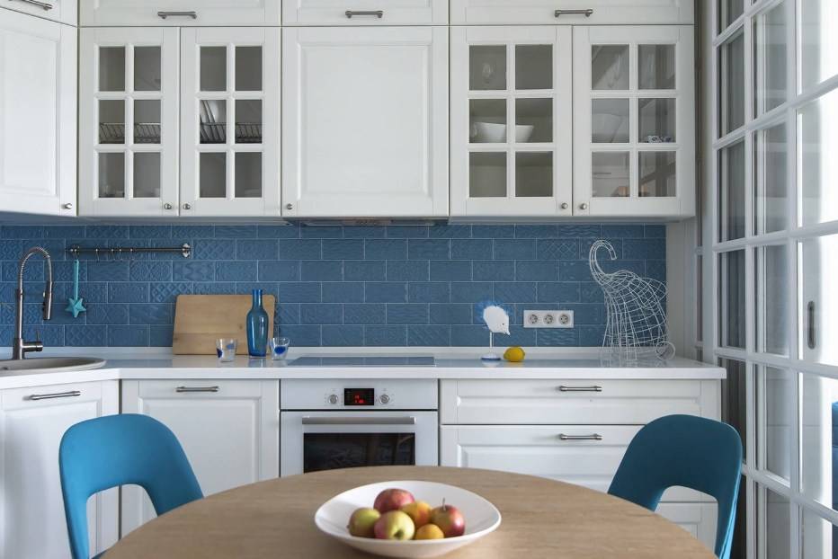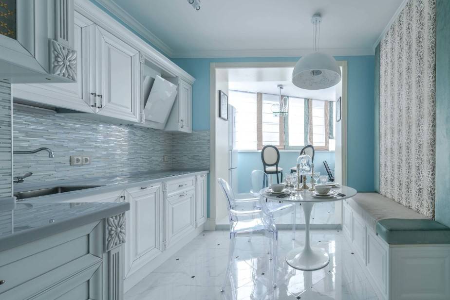 - для получения простора к белой мебели добавляется голубое декорирование;