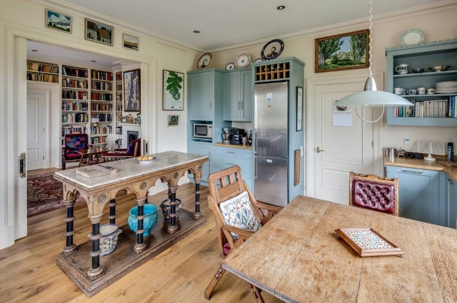 Если стены в гостиной оклеены обоями, то на кухне красить нужно подобным оттенком, а лучше тоже использовать обои. Неплохо сочетается применение разных оттенков одного цвета, но светлую гамму наносить в гостиной, темную на кухне.