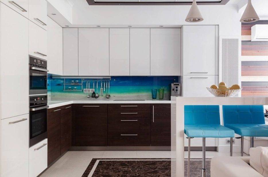 Данный вариант обустройства интерьера больше подходит для просторных или среднего размера помещений. На маленькой кухне он не будет выглядеть так эффектно, и сделает ее еще более тесной.