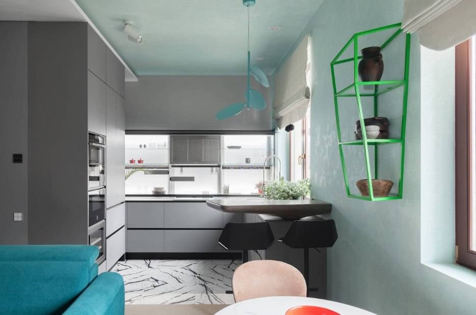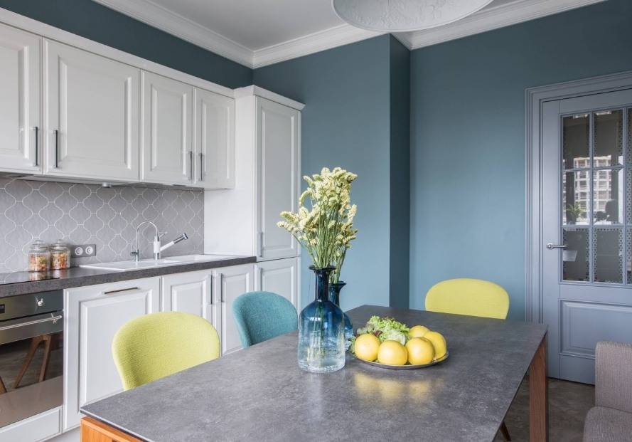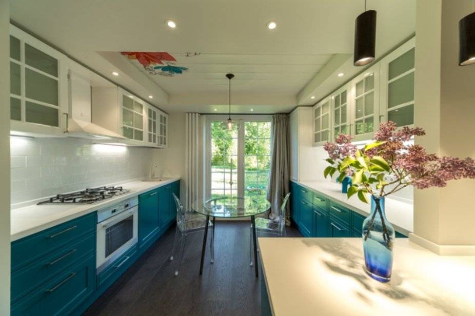Выбирая яркий цвет, красить можно только 1 стенку, которая находится на другой стороне от дверей. Запрещено использовать краски на узкой кухне в 2 уровня.