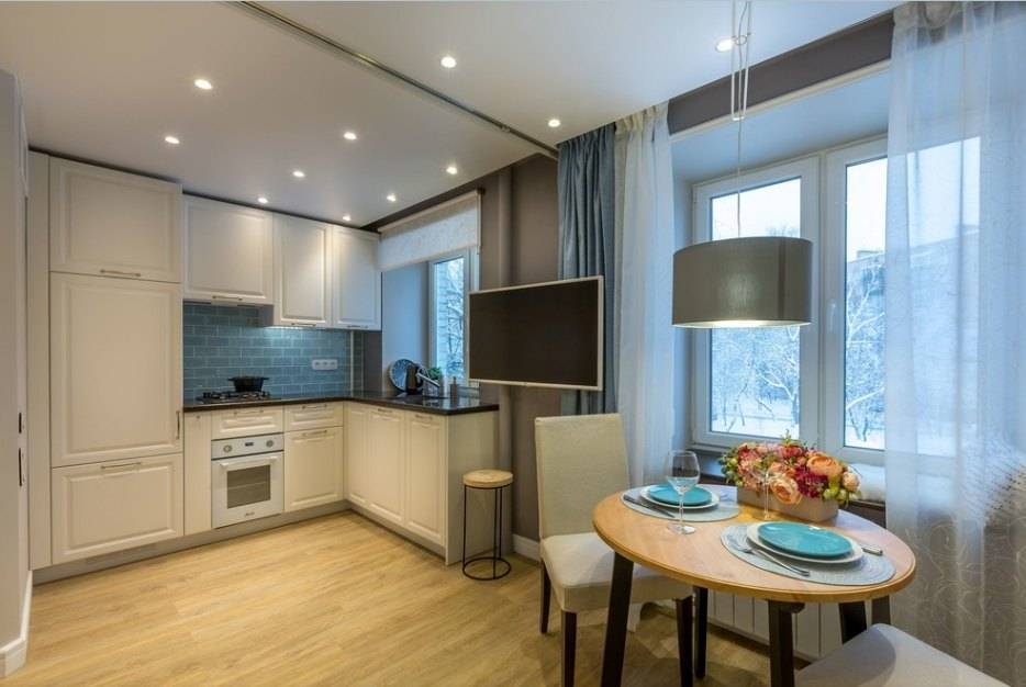 Полочки с посудой, фартук или холодильник это поможет ориентироваться по комнате и сделать пребывание в ней удобной. Еще одно преимущество — это возможность создать новогоднее или рождественское настроение благодаря простой замене молочной скатерти или тарелок на алый. В малогабаритном помещении такие акценты сделают пространство визуально шире, но их излишество наоборот сузит его.