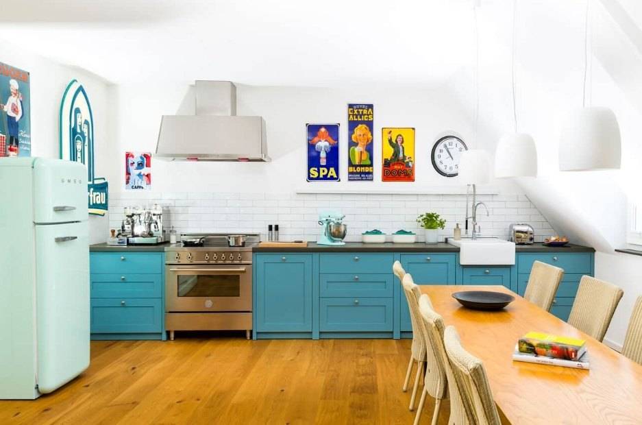 Оригинальный подход к дизайну кухонного пространства. Разнообразие ретро позволяет использовать детали одной или сразу нескольких эпох. Цветовая палитра отделки и мебели может быть достаточно смелой (красный, бирюзовый, зеленый оттенки), текстиль – броским