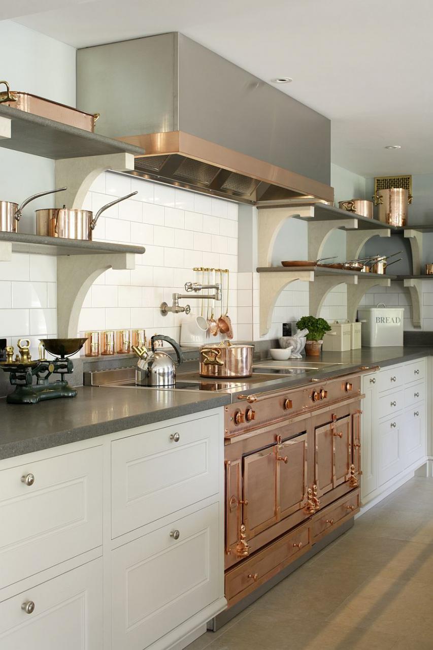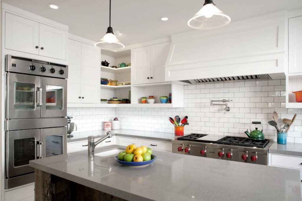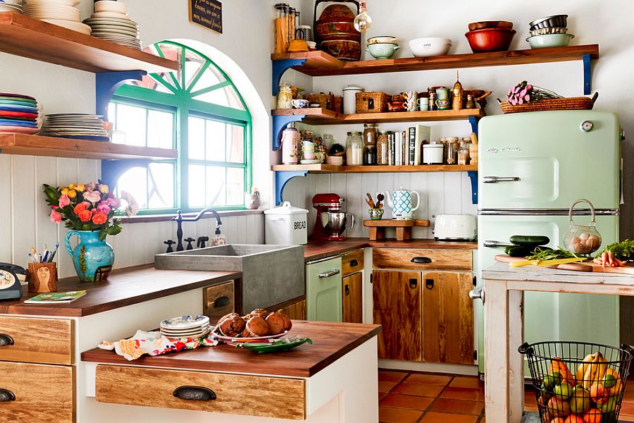 В больших помещениях открытые полки создадут атмосферу уюта, ведь на них, помимо посуды и кухонных принадлежностей, можно расставить интересные декоративные элементы и яркие аксессуары.