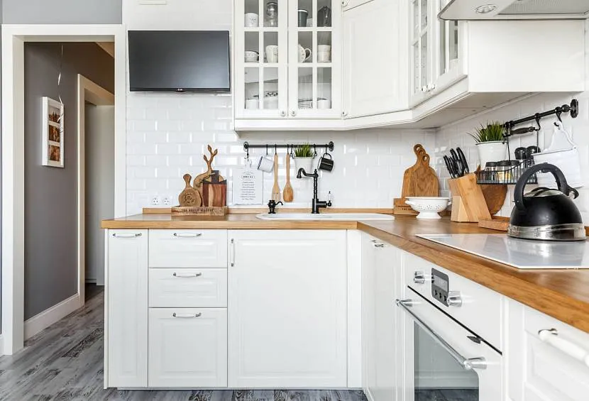 Белый фасад с деревянной столешницейИсточник gd-home.com