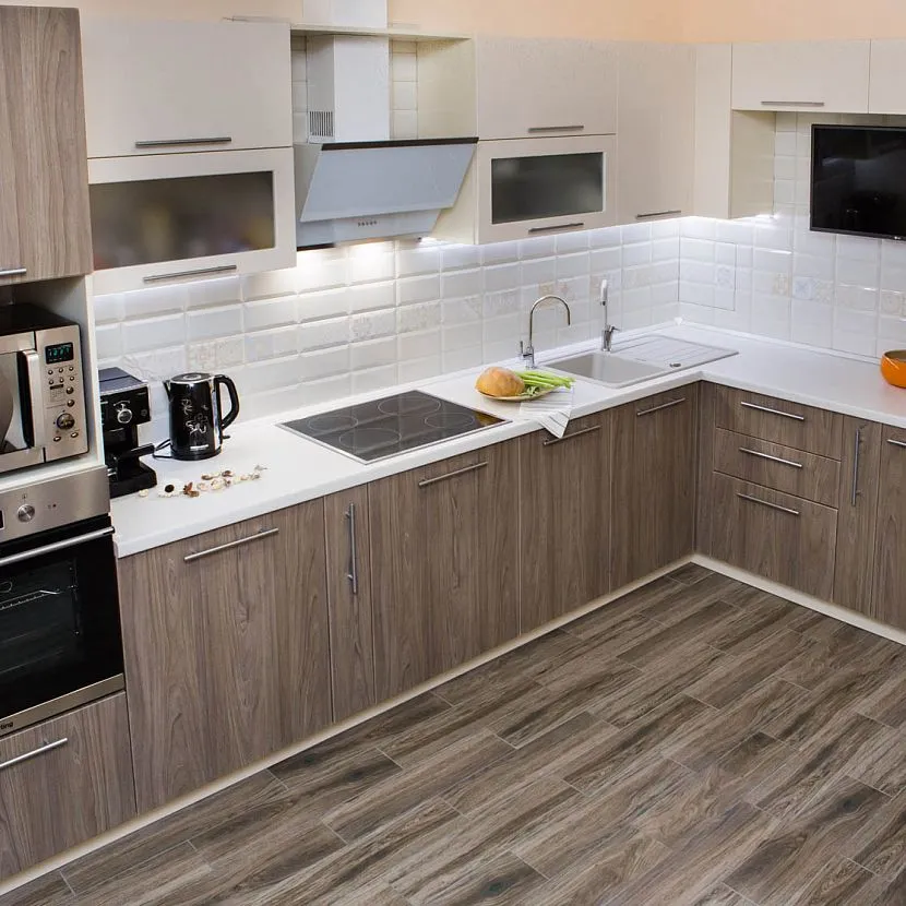 На фото угловой кухонный гарнитур с фасадами, стилизованными под дерево.