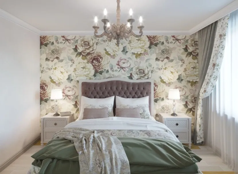 В основном фотообои находятся у изголовья кровати. Выполняется комбинация с деревянной мебелью, золотым напылением и темными оттенками. Используются симметричные крупные узоры, зачастую вензеля, утонченные детали с яркими оттенками и плавные переливы.