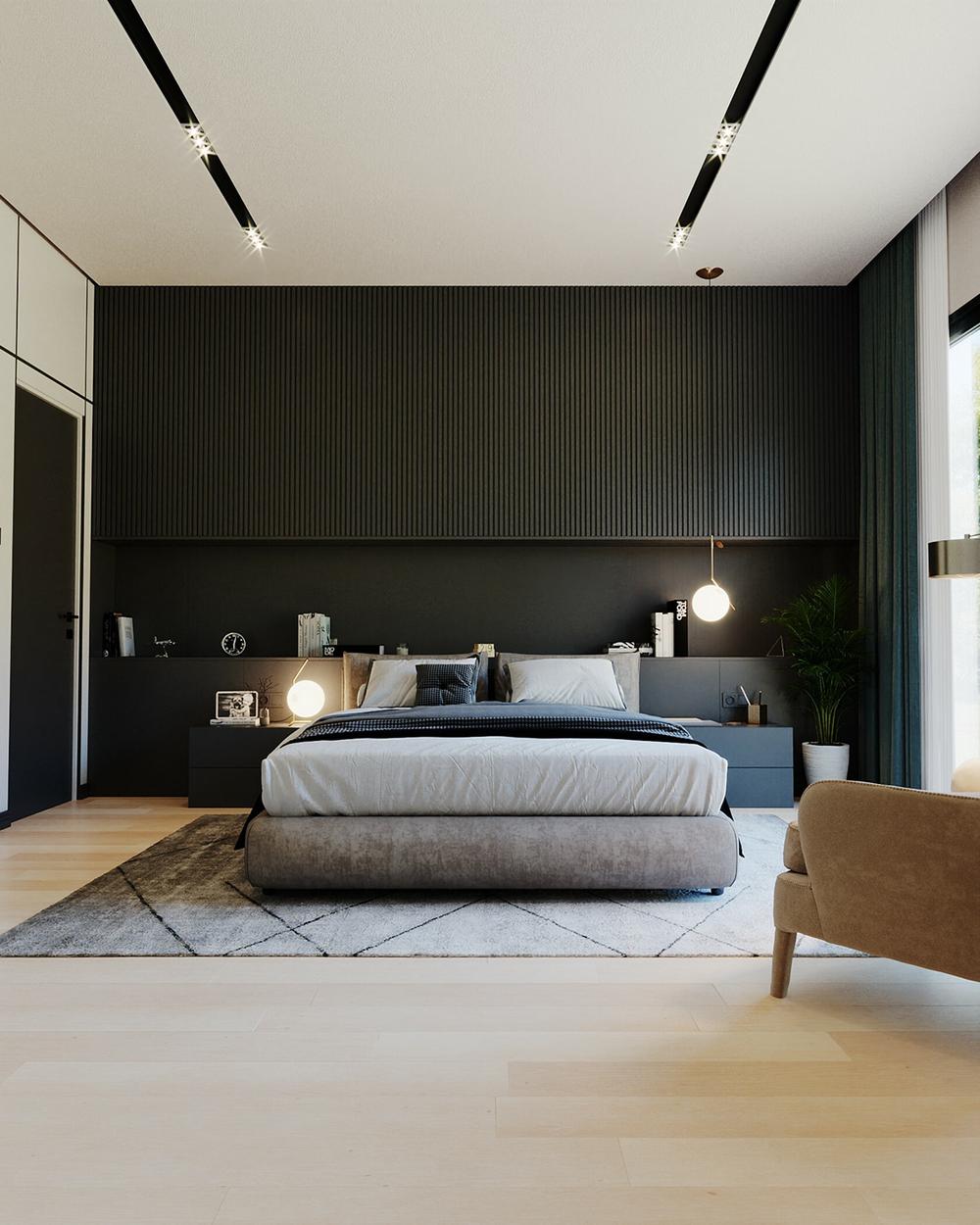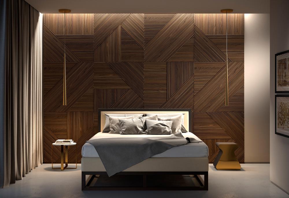 Уместными станут и неброские геометрические узоры. Обычно под оклейку трехмерными обоями выделяют стену у изголовья кровати, но эксперименты не запрещены.