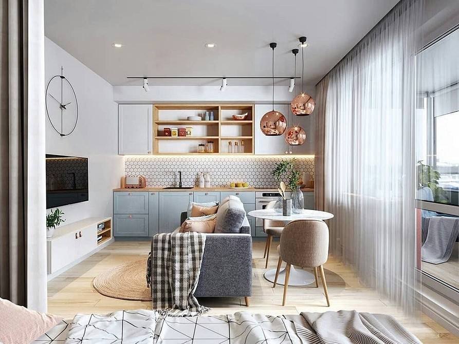 Если квартира с балконом, то появится дополнительная площадь, которую обязательно надо включить в дизайн-проект. Если позволяет конструкция дома и стену балкона можно снести, появится отличное место для дивана, стола или кровати. Если нет, то балкон можно утеплить и обустроить зону хранения, отдыха или рабочее место.