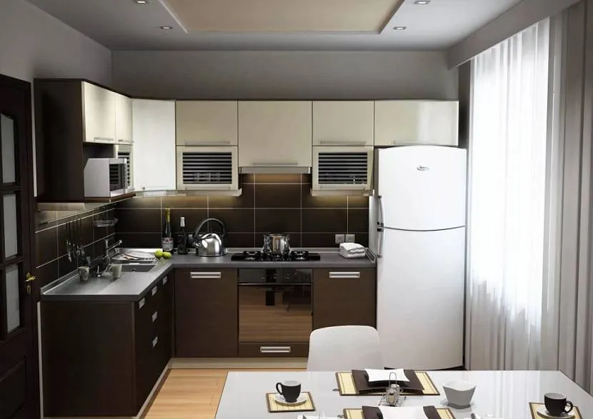 Большой интерес в расположении вызывают небольшие кухни. Нужно очень тщательно все обдумать, для того чтобы обставить маленькую территорию всем самым ценным. Часто дизайнеры в своей работе используют модерн (большое количество шкафов, для них хозяйки с радостью найдут применение). Обычно, холодильник, газовая плита, раковина стоят на одной прямой, с промежутком порядка (350) сантиметров.