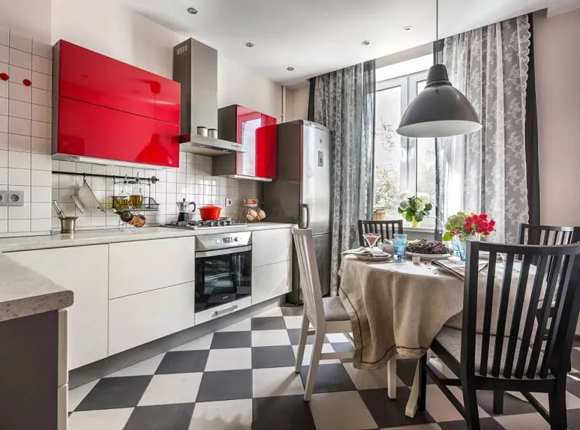 Можно выбрать нейтральный оттенок стен и яркий гарнитур на его фоне. Поддержать такое решение в дизайне кухни 10 кв. м. позволят яркие шторы того же оттенка или элемент декора.