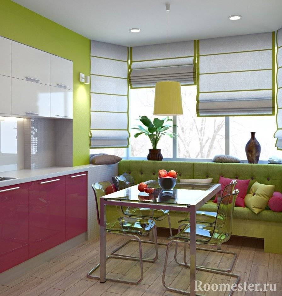 Потрясающе смотрится дизайн розовой кухни с занавесками черного, винного, бордового, малинового или темно-вишневого цвета. Для того, чтобы оживить пространство можно использовать полотна с принтами. Мелкие узоры добавят помещению непринужденный облик, а более крупные орнаменты наделят его строгостью и солидностью.