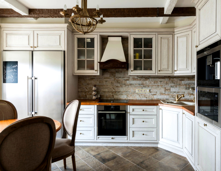 В классическом стиле подразумевается деревянная угловая кухня со встроенным холодильником, посудомойкой и другими приборами, скрытыми за дверцами шкафов. Фасады в основном имеет естественную текстуру или окрашивается в спокойную и сдержанную гамму.