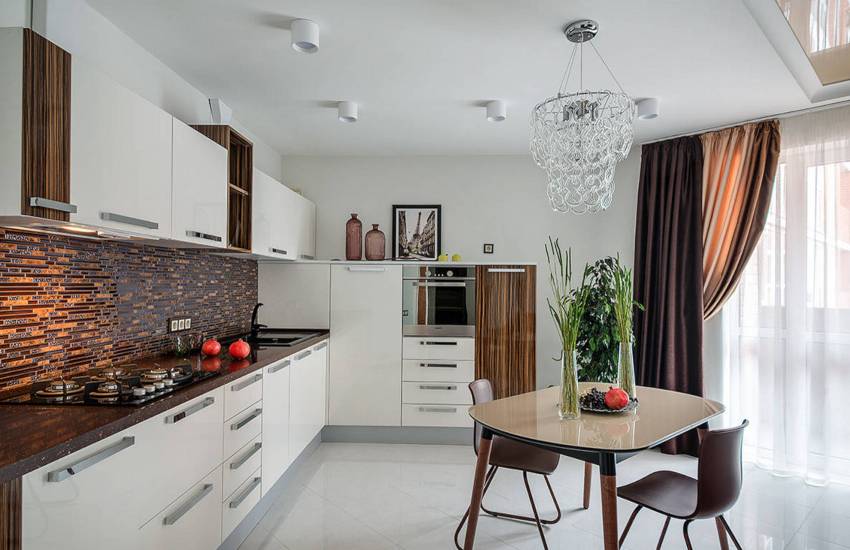 Рекомендуется выполнять зонирование с помощью различных вариантов организации света. Например, над обеденным столом размещается большая люстра, а столешница подсвечивается посредством точечных спотов, встроенных в потолок, или диодной ленты, закрепленной под верхними шкафчиками.