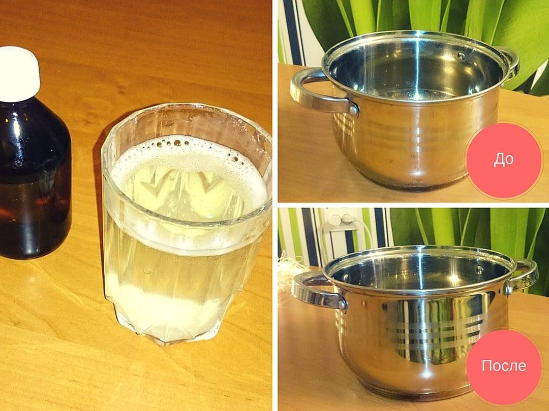 - Для кухонной утвари из нержавеющей стали, подойдет раствор из соли с уксусом в равном соотношении. Им натирают все поверхности, хорошо смывают водой.