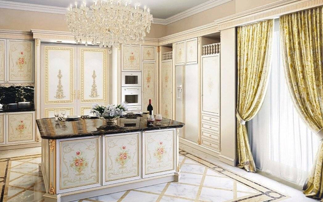 Воссоздание стиля барокко в кухонном интерьере предполагает использование теплой цветовой гаммы. Набольшей популярностью пользуется песочный оттенок, благородный беж и нежный кремовый.