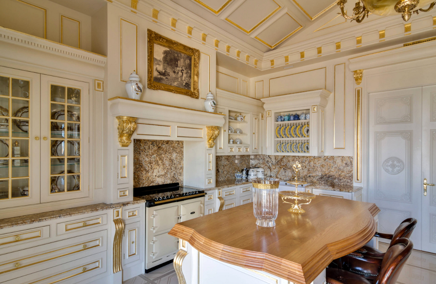 - Арт-Едко. Данный стиль для тех, кто не приемлет компромисс между «красиво» и «дорого». Обилие зеркал и позолоты в комплексе с деревом дорогих и ценных пород делают угловые кухни этого стиля желанными там, где любят и умеют ценить прекрасное.
