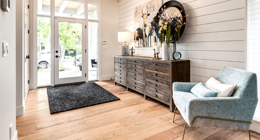 Первая комната, встречающая гостей и уставших владельцев, должна отличаться удобством размещения мебели и практичностью отделки. Здесь необходимо предусмотреть место для размещения верхней одежды и обуви, пуфик и диванчик для переобувания, полочку для ключей, сумок или зонтов.