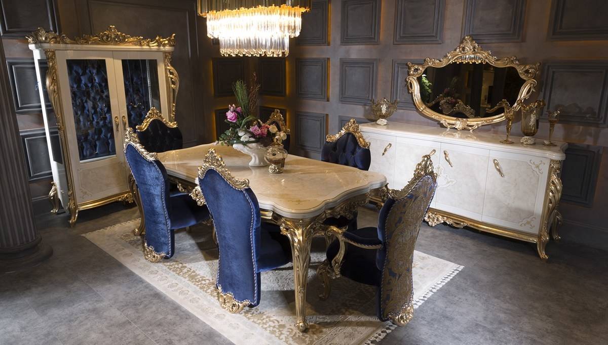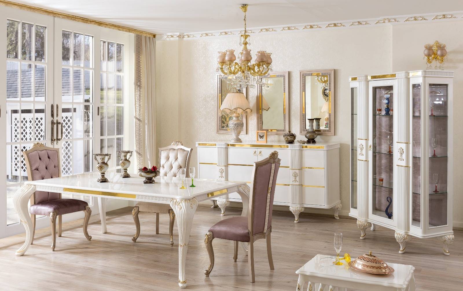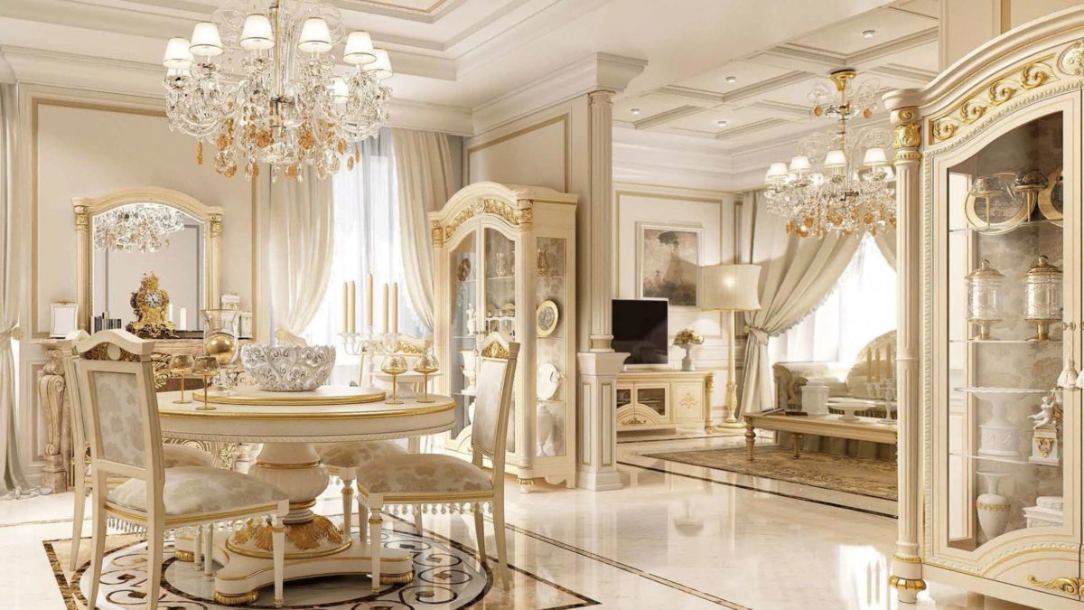 Роскошное впечатление можно создать при комбинировании контрастных сочетаний светлых и более темных вариаций мебели и напольного покрытия. Роскошь обстановки поможет подчеркнуть обилие позолоты. Она присутствует на резных карнизах и фасадах, стульях, обеденных столах.