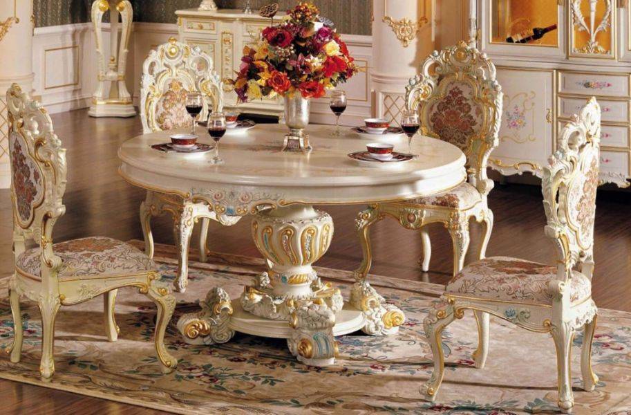 Изогнутые ножки кухни, стульев и столов придадут мебели эксклюзивность. Столешница зачастую массивная с резными краями, украшенная позолотой. Спинки и седушки преимущественно овальной или круглой формы с тканевой обивкой.