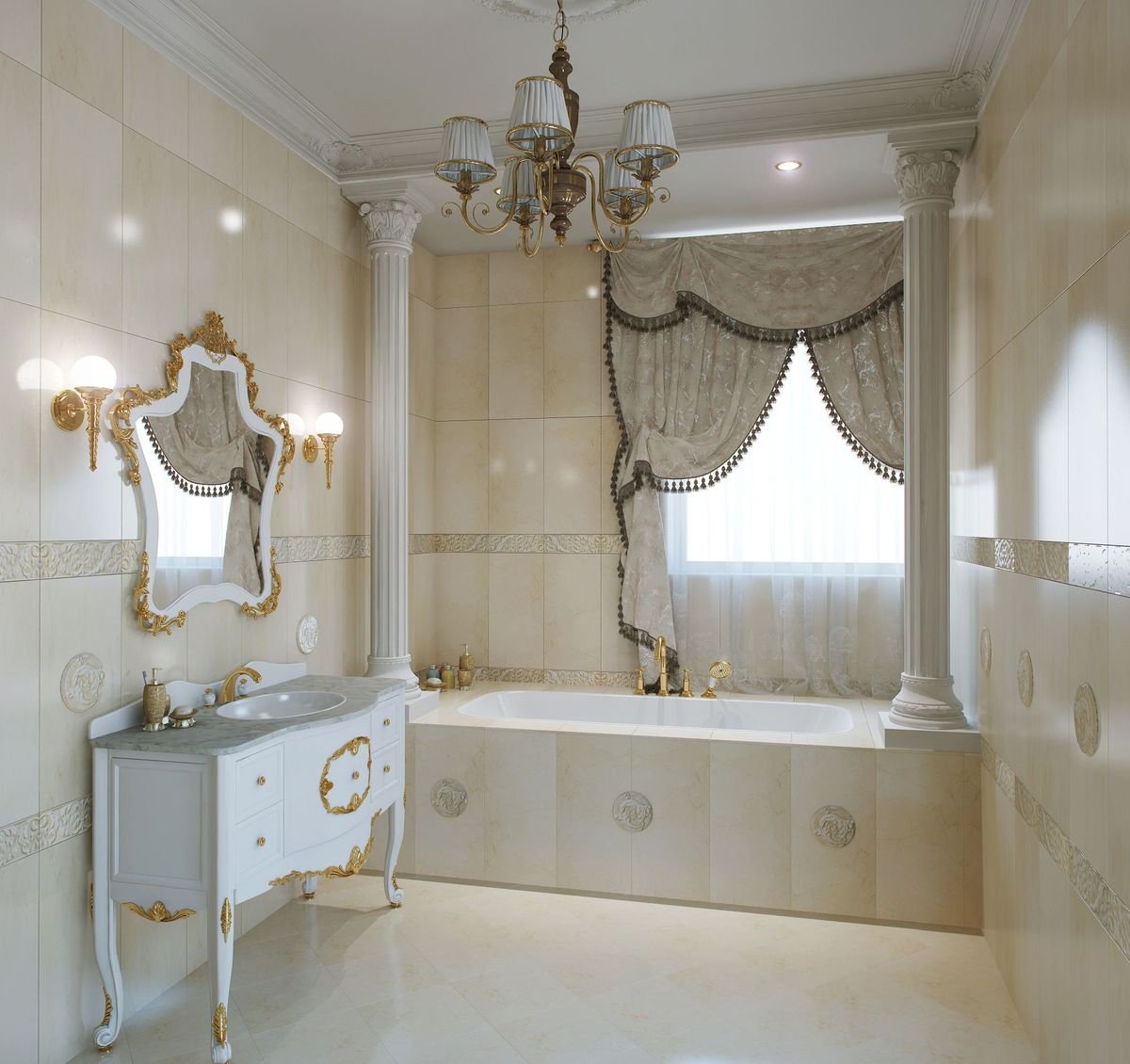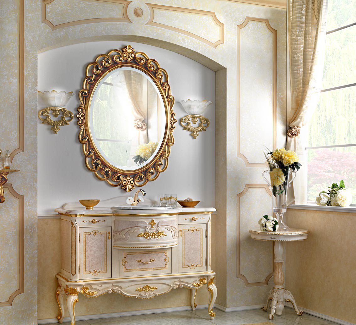 Бело-золотое великолепие дополнят позолоченные краны, подсвечники, металлические кофейные сервизы, кувшины подносы, вазами. Более темный пол и стены на фоне сдержанных акцентов позолоты и белой мебели позволят создать действительно роскошный интерьер.