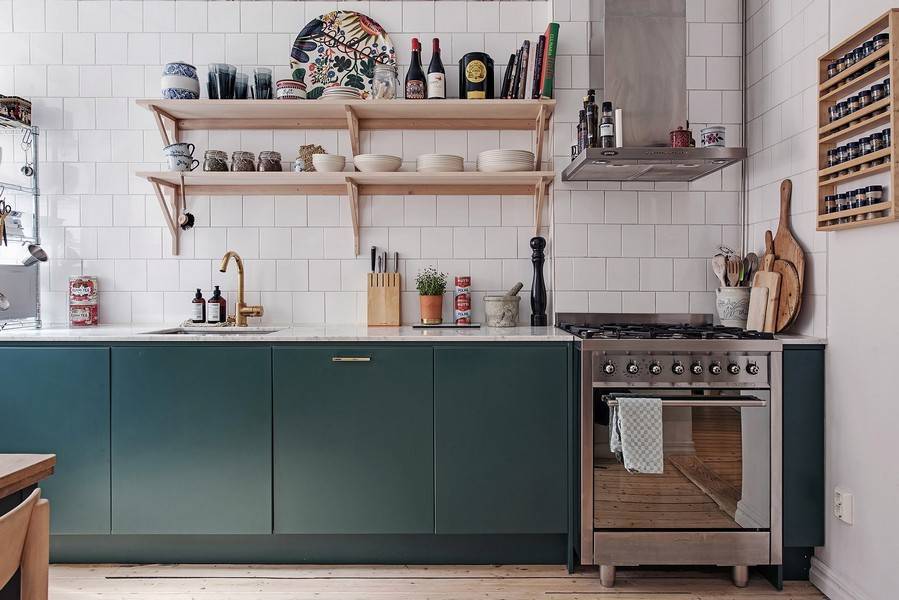 Для интерьера середины века подойдет гарнитур с глянцевыми фасадами сочных оттенков, которые отлично сочетаются с белыми стенами и разноцветной напольной плиткой. Для оформления в духе начала века придется приобрести мебель с патиной, резьбой и другими декоративными элементами, которые и сейчас выглядят изысканно и дорого.