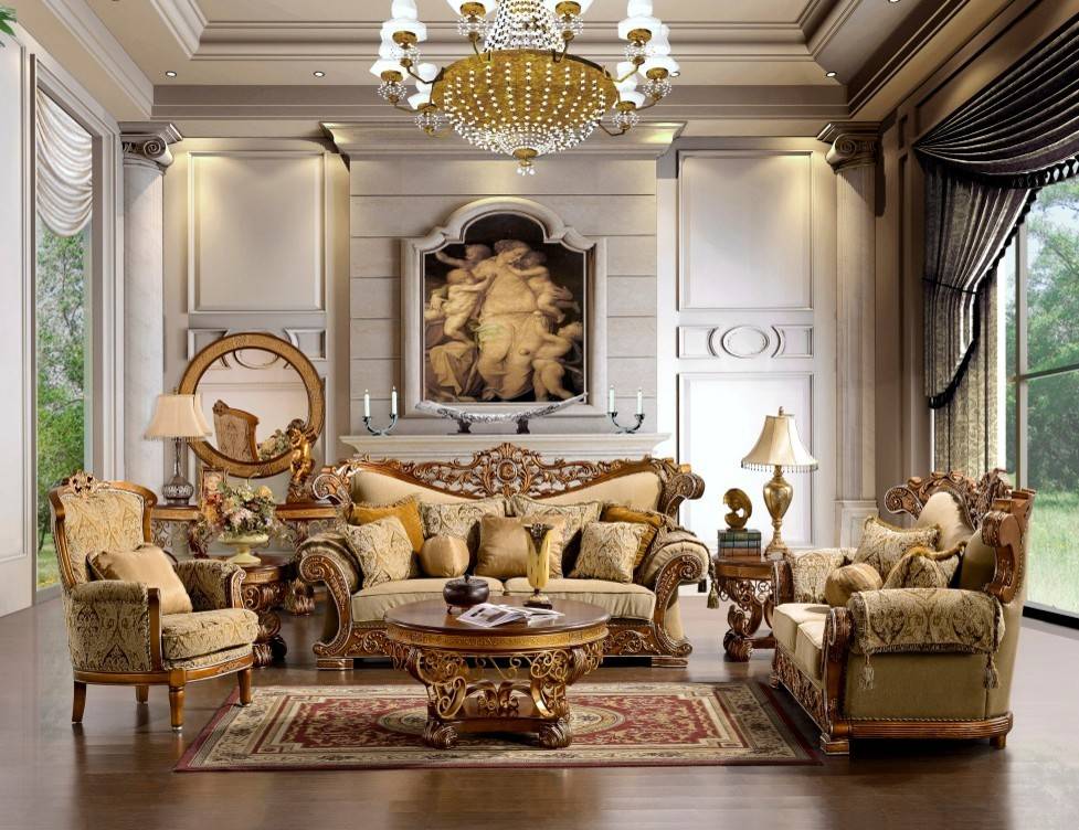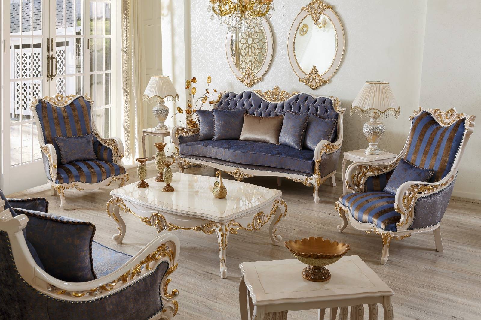 Гостиная в стиле барокко не редко составлена из двух-трех диванов и двух-четырех кресел, а также пуфиков, мягких кофейных столиков и козеток. Могут присутствовать каминные, читальные уголки с дополнительным комплектом мебели.