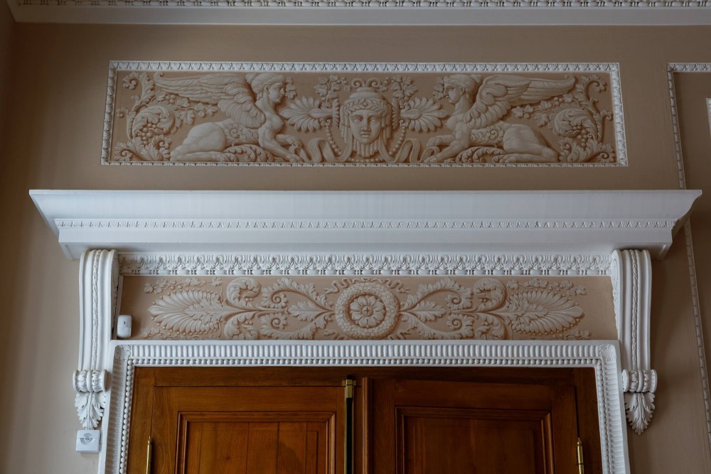 В отделке стен присутствуют медальоны, псевдоколонны, гипсовая лепнина разных форм и размеров, молдинги, карнизы, гипсовая отделка стен, выступов, потолка, арок и других архитектурных элементов.