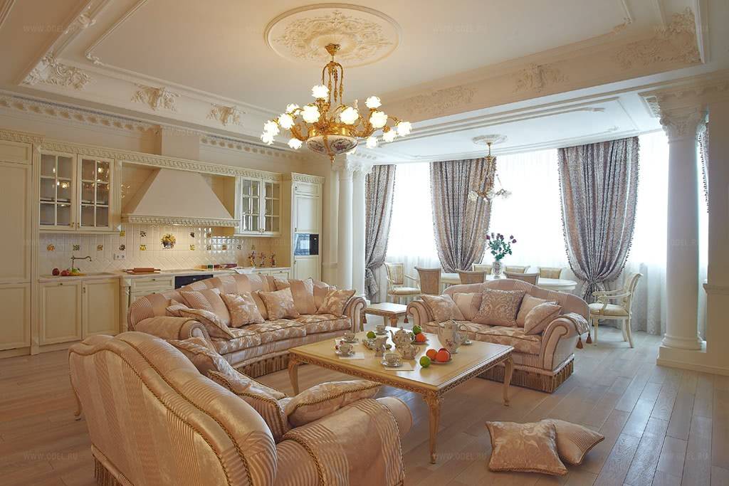 Для гостиной будет актуальной неоклассическая основа в светлых оттенках стен и лаконичном молдинге. Такой выбор ни в коей мере не будет противоречить стилю барокко в интерьере квартиры, а наоборот, добавит характерные для того периода воздушность и простор. Древесное покрытие в ненасыщенных оттенках опять-таки «клонирует» барочную тематику.