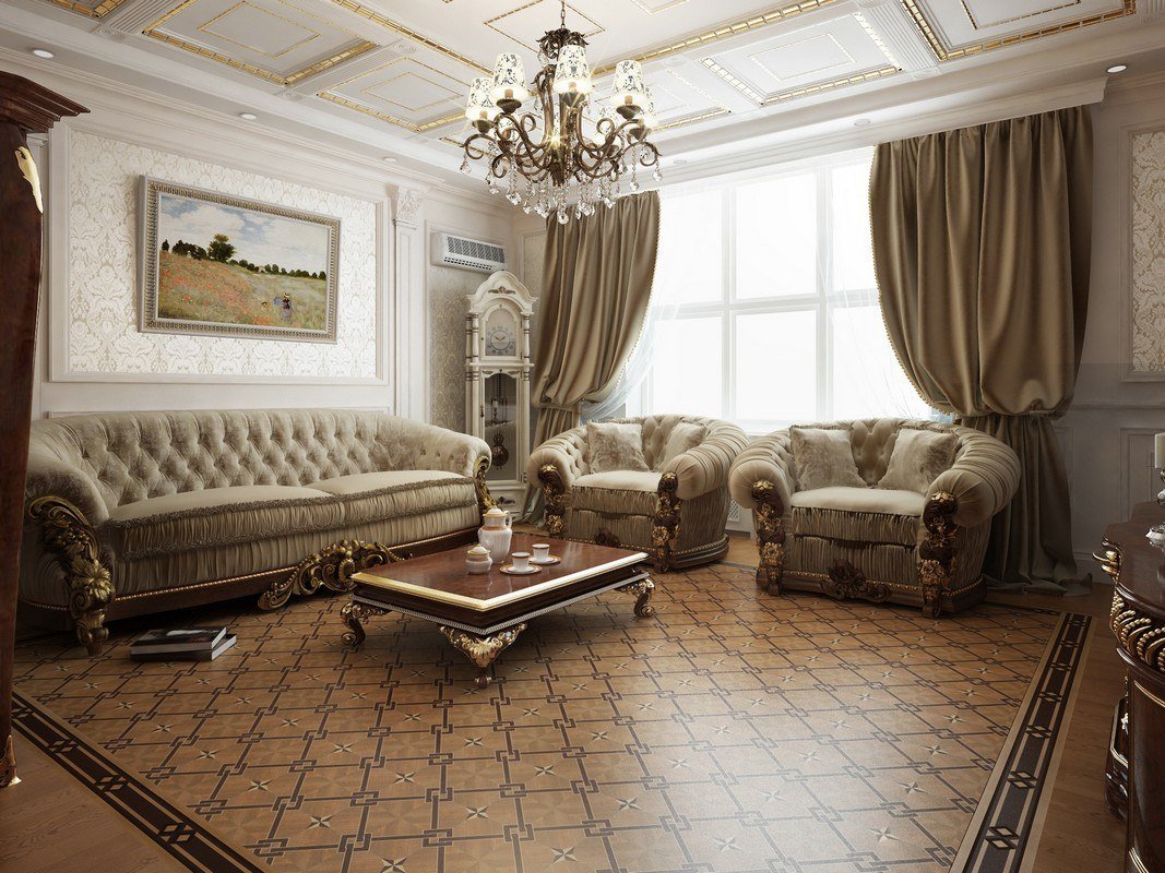 Если владельцы отрицают антикварные вещи, то можно обойтись мебелью Фьюжн-дизайна (под старину). И главное – повторы орнамента в мебели, декоре стен и потолков – это «соберёт воедино» части гостиной.