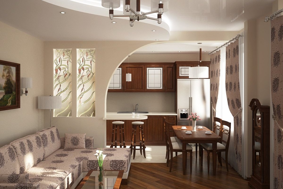 Кухня гостиная с аркой имеет немало важных плюсов: