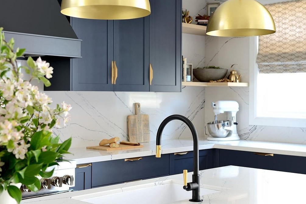 Дизайн интерьера темной кухни с золотыми акцентами в стиле арт-деко