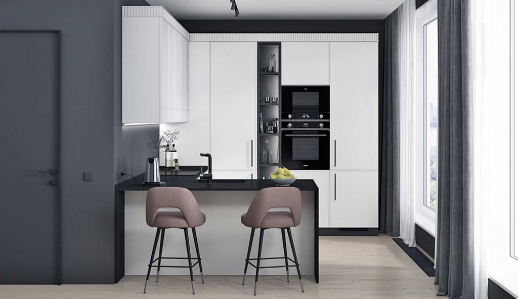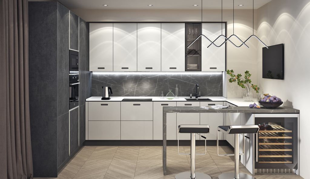 Плюсы: Полуостров – это модуль, который торцом упирается в стену или является продолжением гарнитура. В него можно встроить технику (плиту, холодильник, винный, шкаф) и/или использовать его как рабочее место и барную стойку. Полуостров делает кухню очень удобной и к тому же может разделить ее на зоны – рабочую и столовую или на кухонную и гостиную. При этом полуостров занимает меньше места, чем остров.