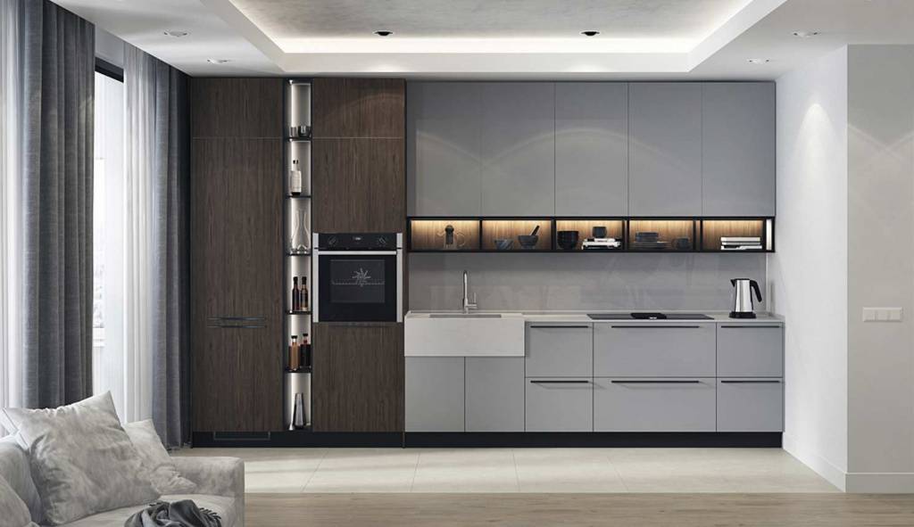 Плюсы: Проста в проектировании, универсальна, хороша в комбинации с островом/полуостровом, а также в случае, если на кухне имеется лишь одна свободная стена. Например, такое часто бывает в кухне-гостиной и в студии.