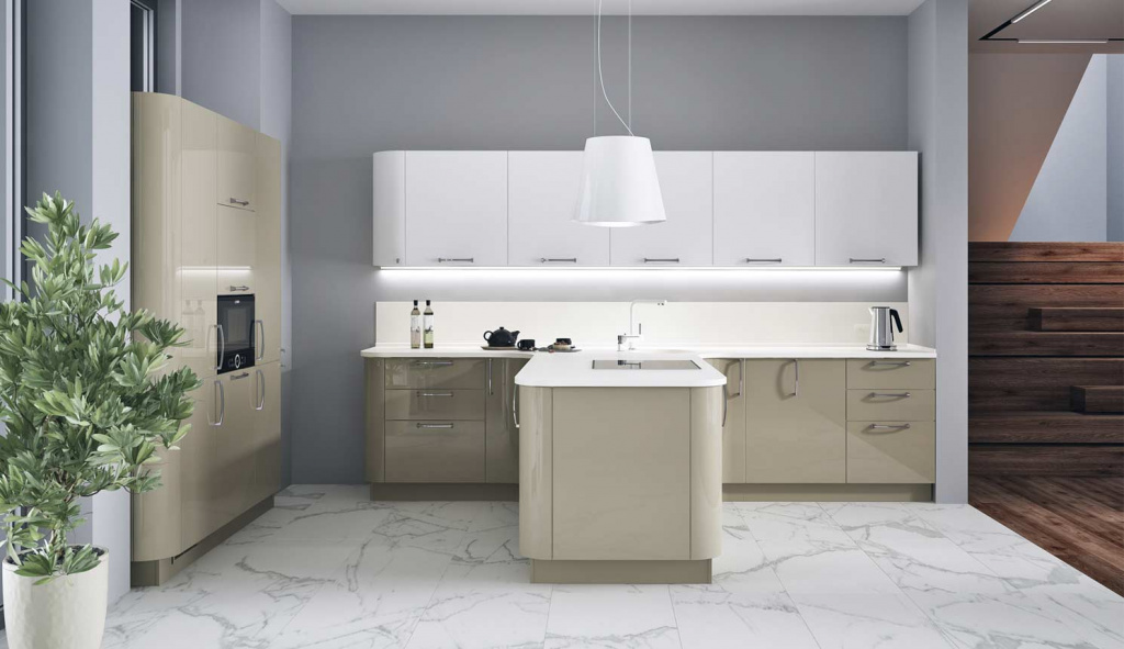 - высокие модули под бытовую технику и узкие пеналы — такие аксессуары не только выглядят модно, но и экономят рабочее пространство для хозяйки;