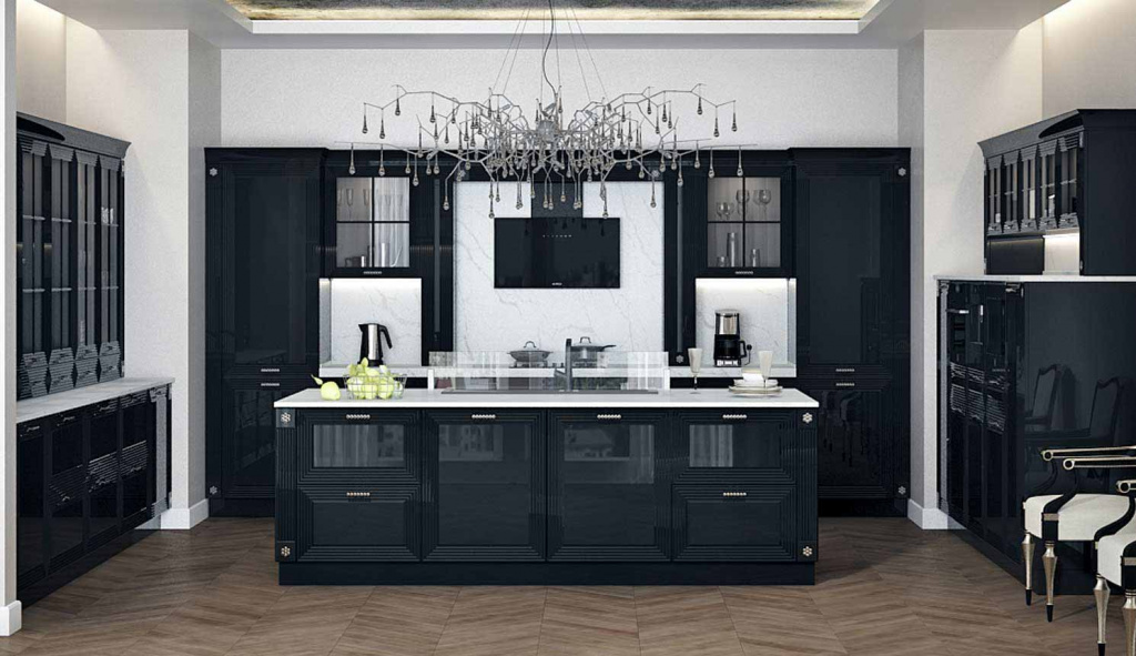 Интерьер черной кухни с золотыми акцентами в дизайне барельефных полуколонн