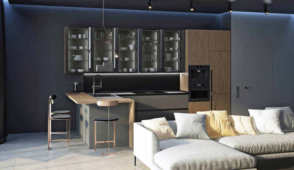 Дизайн темной кухни с разными акцентами: золото, подсветка, изумруд