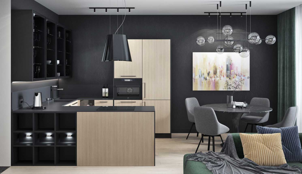 Черно фасады — решение вне времени. Такая мебель эффектно смотрится в любом интерьере и в любом стиле, от минимализма до современного. При изменении соотношений этих двух цветов можно получить совершенно разные кухни. С увеличением числа белых элементов комната становится более просторной и светлой, а с нарастанием темной части фасада — более строгой и солидной. Даже сочетание белого и черного в равных пропорциях позволяет разработать оригинальную кухню, и в том числе создать желаемое зонирование пространства.