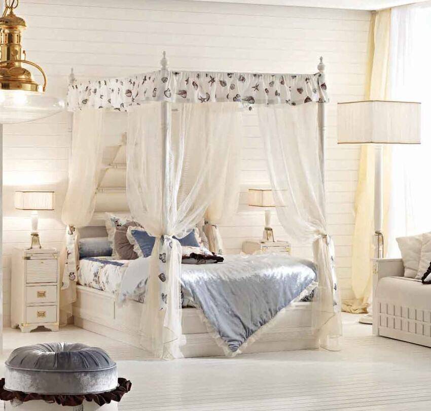 Фантазия ребенка не знает границ. Она способна превратить в игру все вокруг, тем более такой необычный предмет мебели, как балдахин. Предоставьте ему такую возможность, и в какой-то момент в комнате возникнет детский домик, шатер или палатка. Балдахин может быть непрозрачный, из плотной ткани, но не слишком темный.