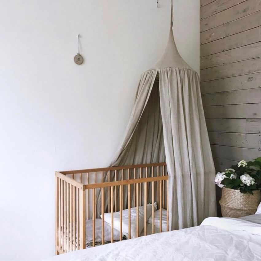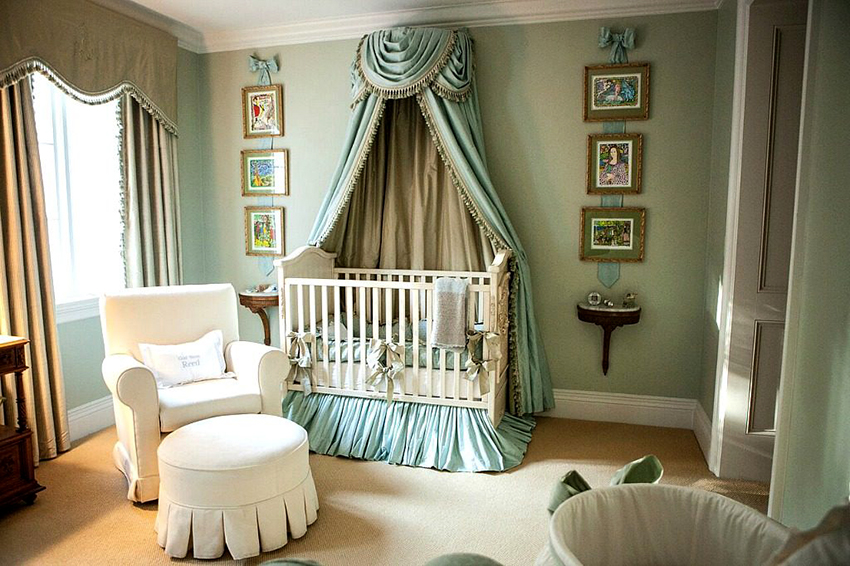 Комната, где подвешен балдахин в детскую кроватку, всегда выигрывает в дизайне. Испортить ее таким атмосферным предметом очень сложно.