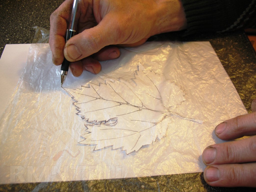 Контур листа или цветка нужно перенести на бумагу. Затем сверху накладывается прозрачная пленка.