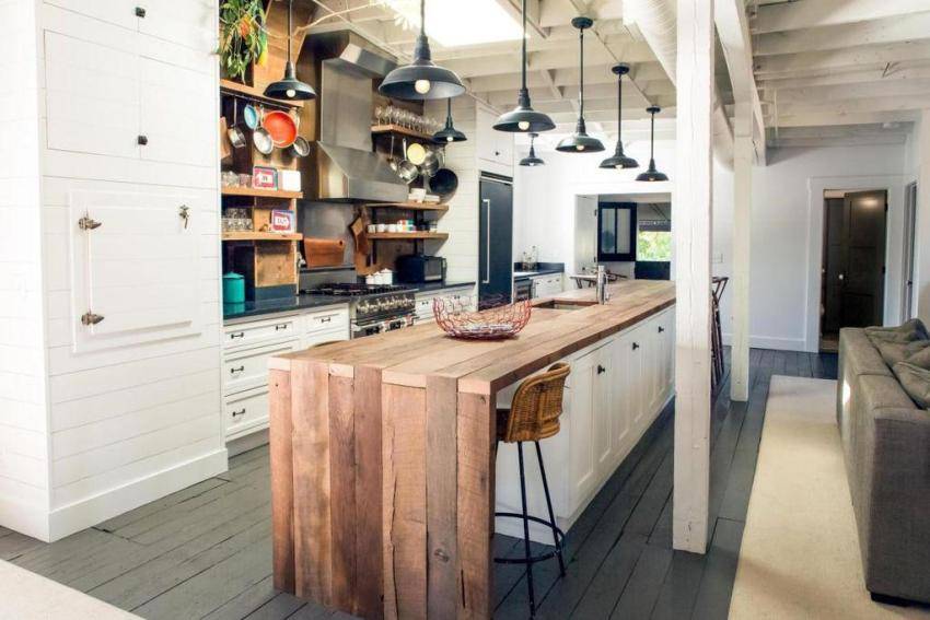 В современном стиле предпочтение отдается материалу, а не декору. Сочетание матового и глянцевого, необычные формы и характерные цвета имеют большое значение. В кухнях в стиле лофт отлично смотрится самая натуральная барная стойка. С ними хорошо сочетаются деревянные или бетонные поверхности, имеющие слегка необработанный вид
