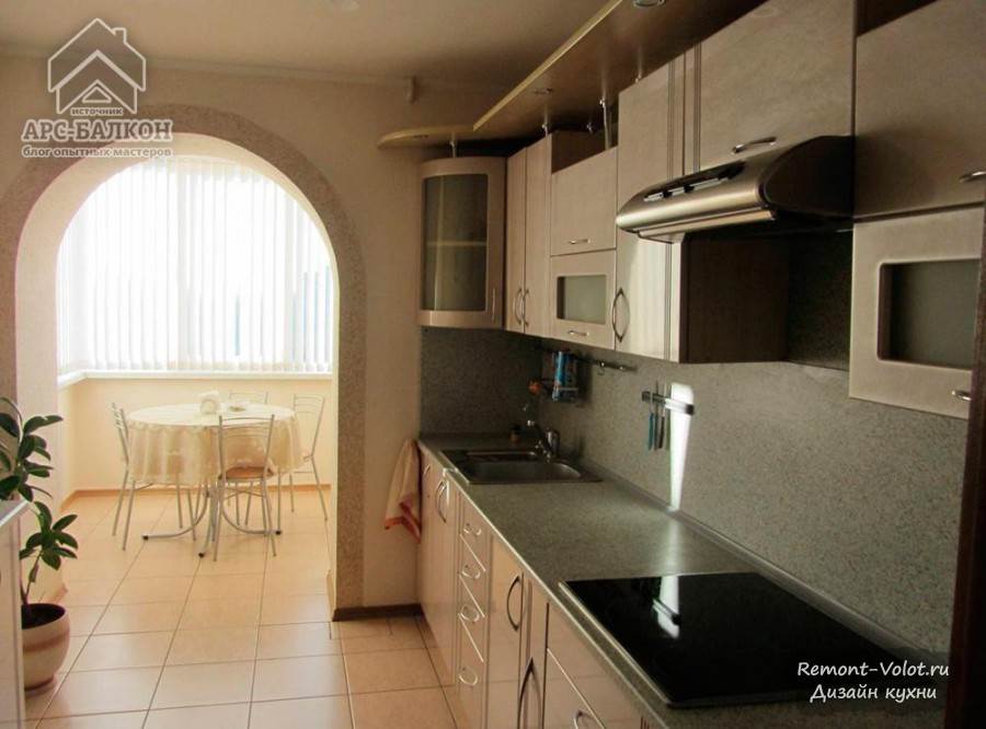 Проем при объединении балкона с кухней может быть выполнен в виде арки. Округлые линии смотрятся более гармонично по сравнению с прямоугольным проемом. Арка пропускает солнечный свет, но четко разводит обеденную и кухонную зоны.