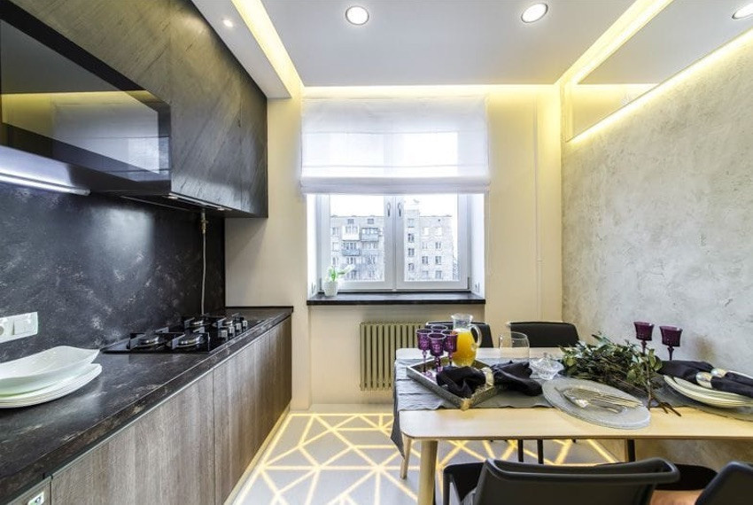 Для визуального увеличения пространства можно установить дополнительную подсветку на светильники и мебель. Точечное освещение также часто используется на кухне.