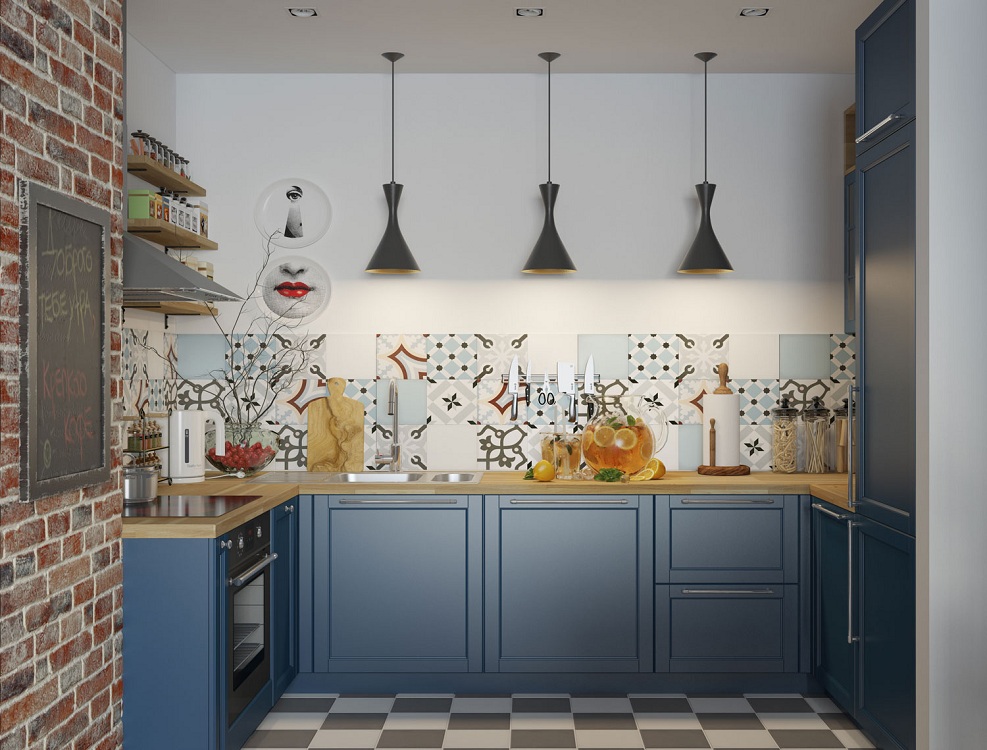 Большое значение в кухне имеет фартук, монтируемый между столешницей гарнитура и навесными шкафами. Этот элемент отделки позволяет защитить стену от различных брызг во время приготовления пищи и мытья посуды. Фартук может создаваться из плитки, пластиковых или ламинированных панелей, а также стекла, декорированного различными изображениями, имитацией натуральной выбеленной древесины или кирпичной кладки. Фартук иногда может делаться контрастным по отношению к стенам и являться ярким акцентом интерьера.