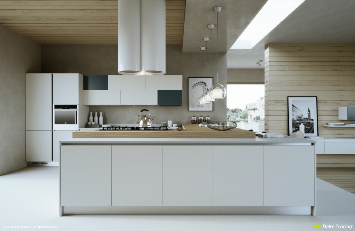 Игра света и тени в этом интерьере обеспечивается наличием диагональных углублений в дверцах шкафов. Деревянные элементы используются умеренно, что усиливает их выразительность и влияние на характер дизайна. Подвесные полки — отличная идея, хороший способ обустроить отдельную систему хранения над кухонным островом.