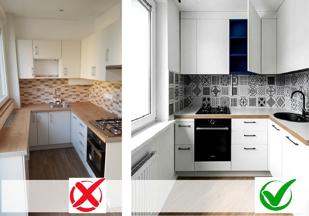 Почти одинаковые кухни визуально воспринимаются по-разному. Во втором случае устройства, подвешенные к потолку, создают больше пространства в области окна.